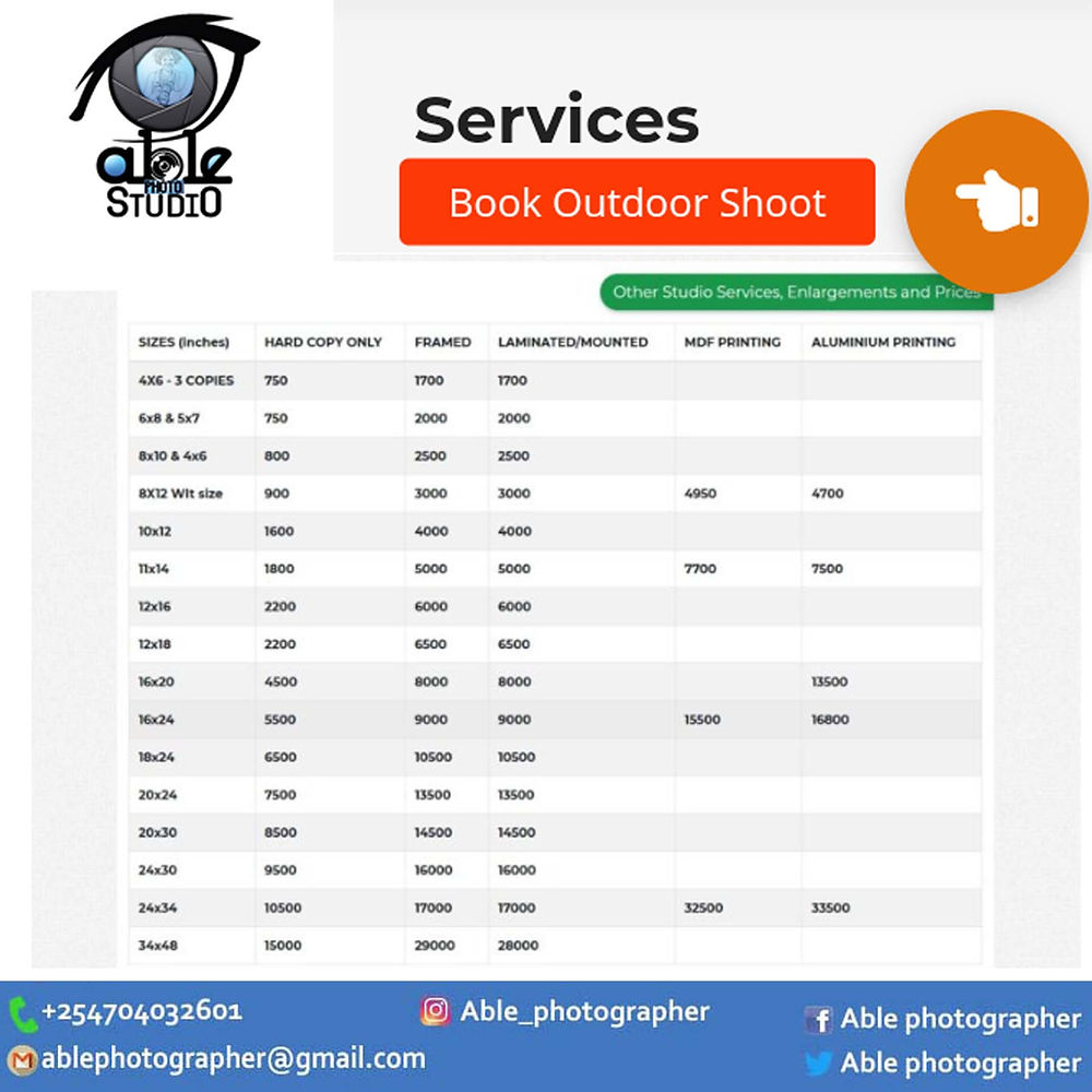ABLE PHOTO STUDIO has been one of the leading Photography Studio providers in Kenya/ Nairobi since 2017. While ABLE PHOTO STUDIO specializes in all types of photography, including portraits, events and weddings,commercial,fashions, graphic design, we also have extensive experience in working with businesses to provide high-quality services that can be tailored to any requirements. Contact us today for more information.